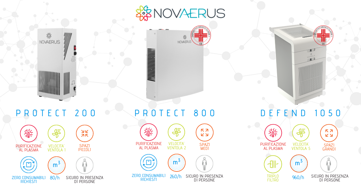 Disinfettare mani e superfici è semplice e richiede pochi secondi. Ma non è sufficiente. Ogni secondo entriamo inevitabilmente a contatto con qualcosa che viene condiviso con molte persone, ma su cui molto spesso non viene esercitato alcun controllo: l’aria! Parlando, tossendo o starnutendo l’organismo rilascia nell’ambiente particelle che possono rimanere sospese per diverso tempo prima di depositarsi sulle superfici ed entrare in contatto diretto con altre persone. Specialmente nei locali idoor, dove disinfettare l’aria che respiriamo deve essere una priorità per garantire ambienti condivisi sicuri. La risposta a questa esigenza è Novaerus.