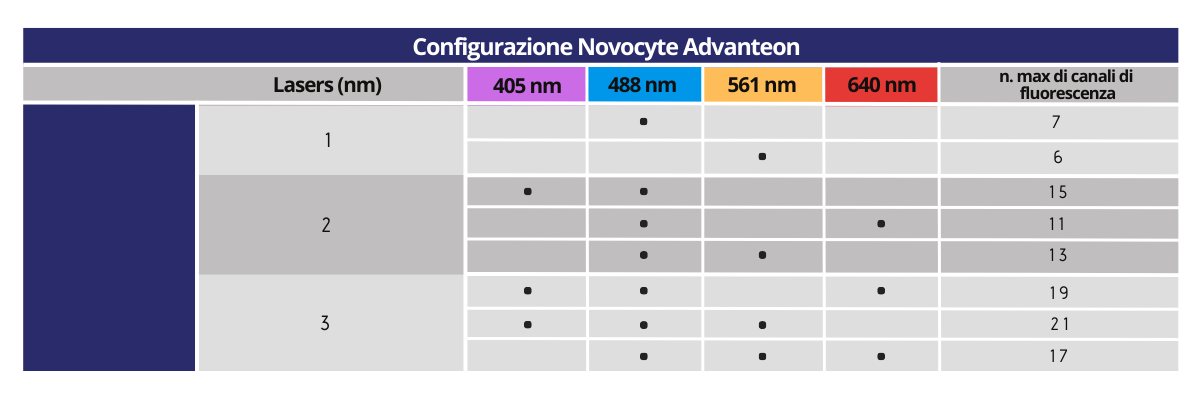 - da 3 a 21 canali di fluorescenza (23 con FSC e SSC)