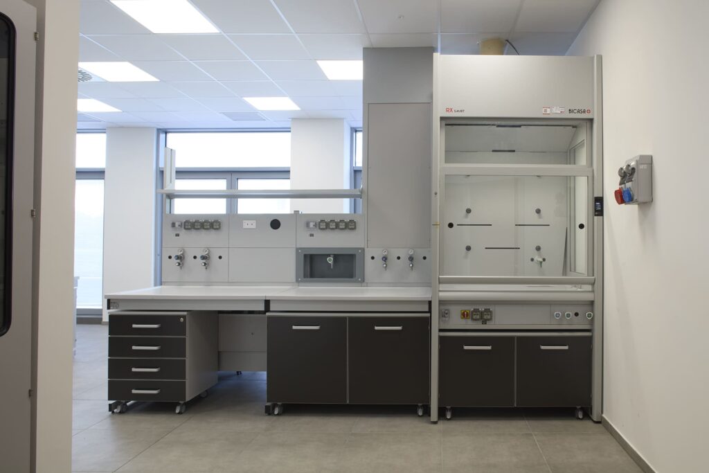 Il diversi laboratori, in base alle specifiche esigenze, sono stati attrezzati con postazioni mobili serie Kompatto, travi pensili Ikaro, cappe chimiche serie RX e cappe a flusso laminare Herasafe.
